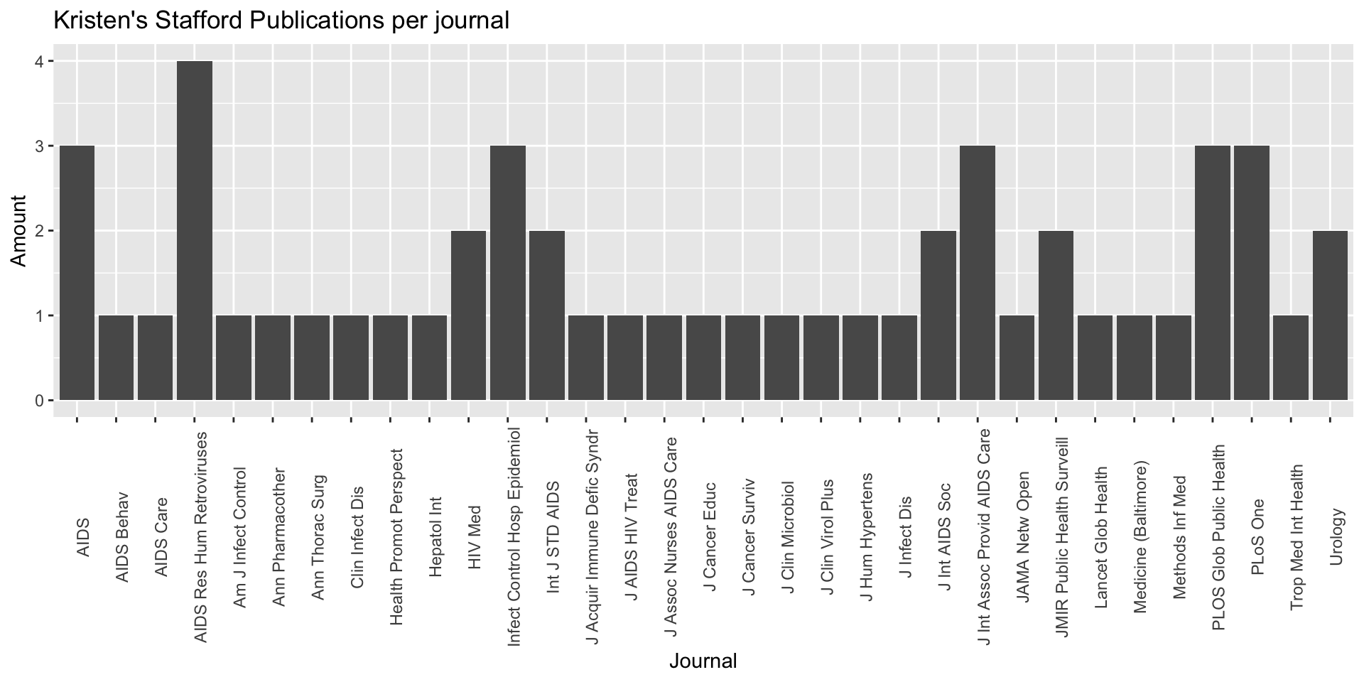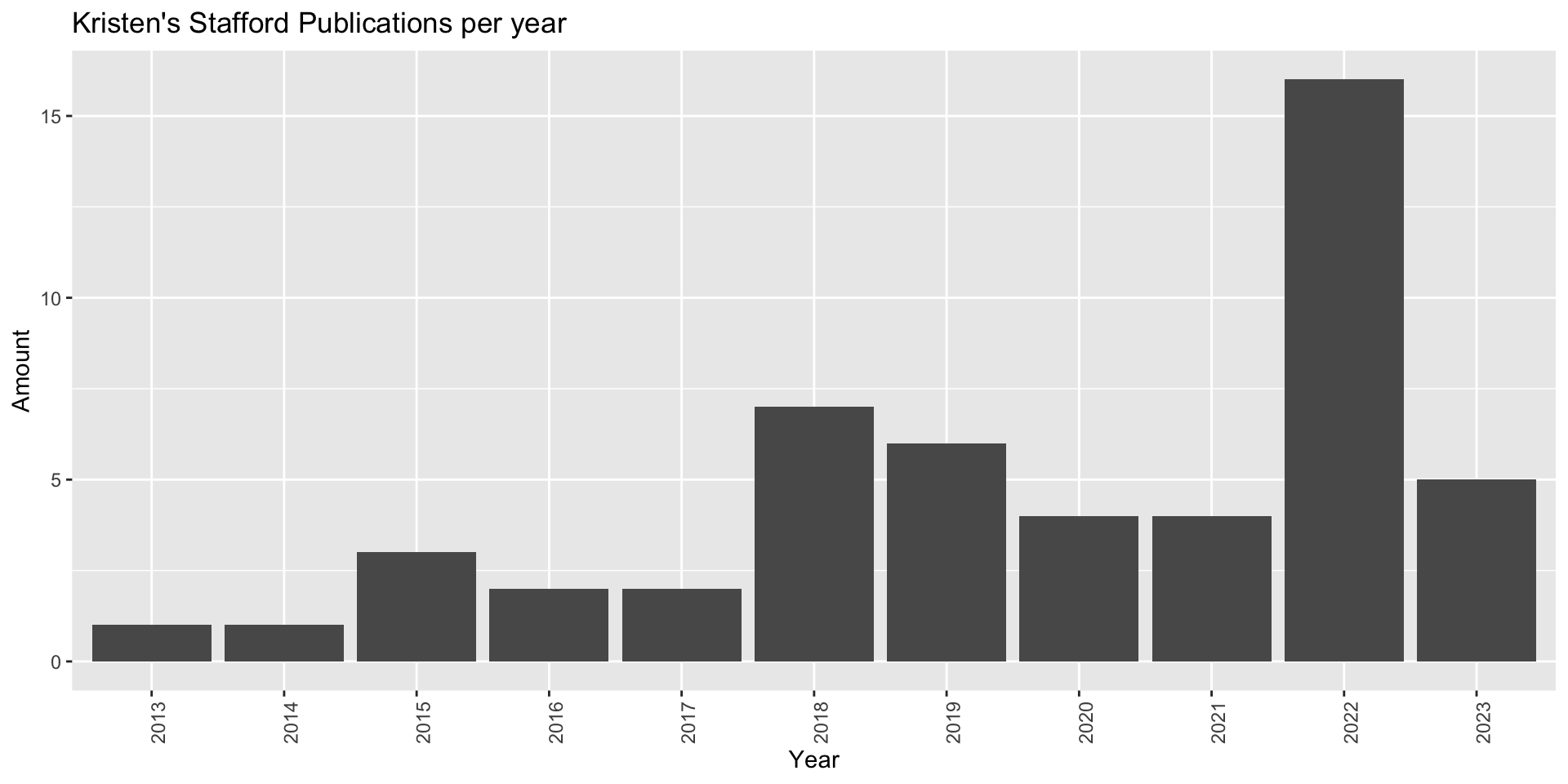 labs(title = "Kristen's Stafford Publications per year", # Set up graph title and labels